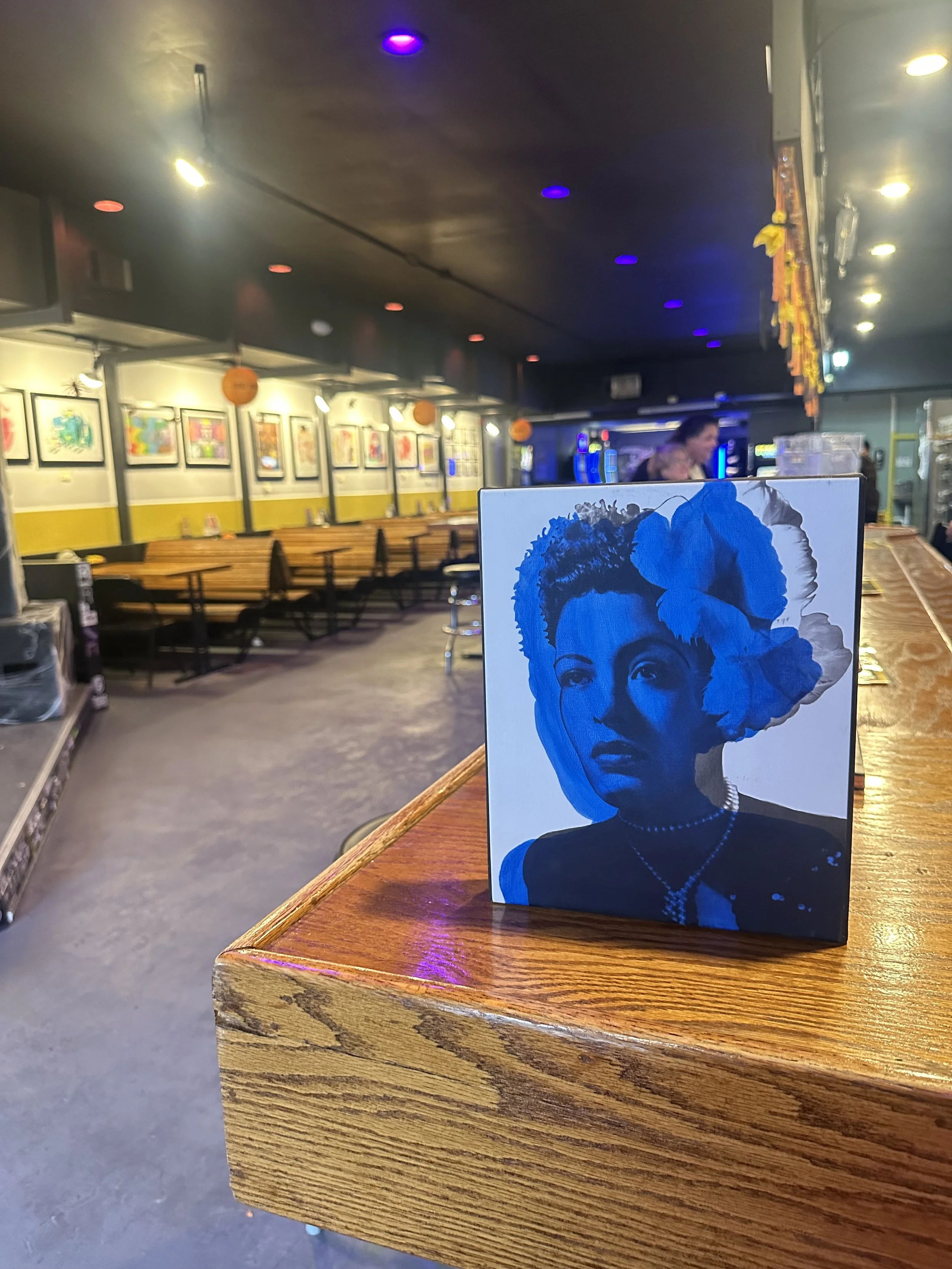 We decided to donate an 8x10 canvas featuring a photo of bisexual icon Billie Holiday overlaid with her silhouette painted in India Ink. This piece was from our IN THEIR SHADOW: PRIDE ICON SERIES.
