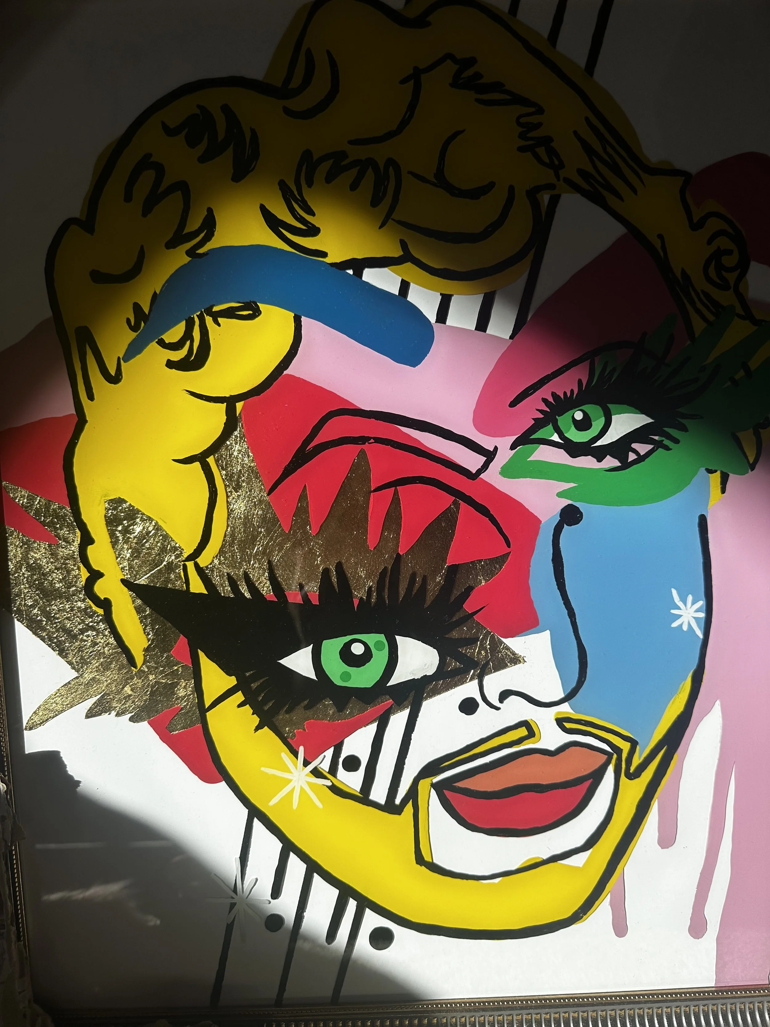 A.B. is grateful to return to their original studio space upstairs in the Julia Building at 212 S. University in Carbondale with 9 new paintings. Inspired by the shapes and faces of friends, family, and performers they admire, A.B. created a collection of “A.B.stract paintings.” These works range in size from 8x10 to 36x36 and were painted on the glass of the metallic frames. A few of these pieces feature additional materials such as fabric, theatrical lighting films, and gold leaf to add texture and depth.